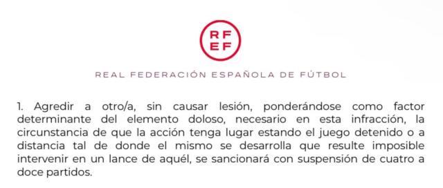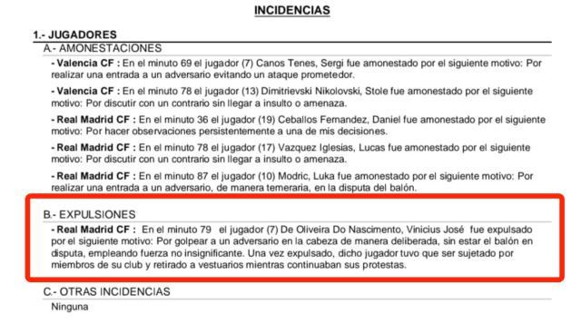 赛后主裁判索托·格拉多在比赛报告中写道:“第79分钟,皇马7号球员维尼修斯被罚下场,原因:在没有球权的情况下,使用不小的力量故意击打对手的头部。被罚下场后,这名球员必须受到俱乐部成员的约束,并被带到更衣室,而他的抗议仍在继续。”西班牙媒体报道,由于维尼修斯的行为发生在裁判吹停比赛后,按照足协的处罚规定,如果该行为被定义为与比赛无关的“恶意伤害”,他将面临4-12场停赛,无缘参加西班牙超级杯。
